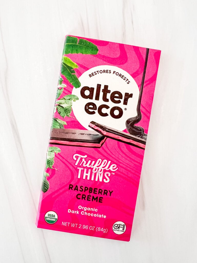 Alter Eco’s Raspberry Crème Truffle Thins is a chocolate and berry lover’s dream combination! This beautiful chocolate bar features an organic dark chocolate bar filled with fruity raspberry crème. It’s sweet, slightly tart, and perfect for spring snacking. Alter Eco chocolates are always certified gluten free.